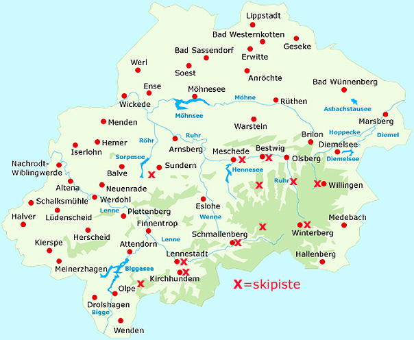 In Sauerland zijn 21 skipistes, waaronder 7 ‘zwarte’ pistes. Met 150 liften, over 100 km pistes en afdalingen tot 2 km lengte (hellingen tot 30 %) is Sauerland een zeer interessant skigebied voor jong en oud. Er is altijd wel een skilift te vinden in de buurt van het vakantiehuis Duitsland. De grote skipistes zijn de plattegrond (X=skipiste) te zien. Er zijn echter nog veel meer kleinere sleepliften in Sauerland. Link skigebieden Sauerland: http://www.wintersport-arena.de